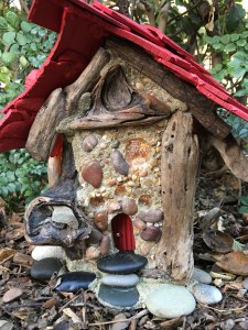 Tidbit is occupied by a woodworker fairy. You can see his preoccupation with gorgeous driftwood burls.  There are two: one at the top of the front wall, and another that holds fast to a small pebble on the left side of the same wall.